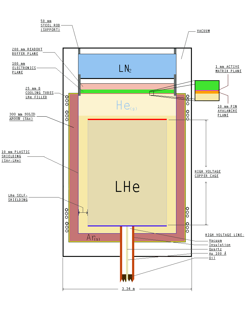 - The LHe e-Bubble Chamber system comprise of the LHe e-Bubble Test Chamber and LHe/LN2 Cryostat. The LHe/LN2 Cryostat provides a low temperature of 4.2K environment, which contains the LHe test chamber and provides the helium vapor cooling (2.2~4.2K) to it. The LHe/LN2 Cryostat includes a vacuum chamber, a liquid helium service vessel, and a liquid nitrogen service vessel, which are disassembled to get access to the test chamber. Two radiation heat shields (80K and 4.2K) are thermally attached to the two vessels, respectively. The cryostat has two optical windows at the sides and one at the bottom of the vacuum chamber and each heat shield for radioactive sources, light transportation and optical measurements.
