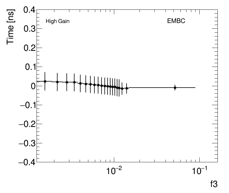 | Average Cell Time vs Fractional Energy Deposit High Gain EMBC |