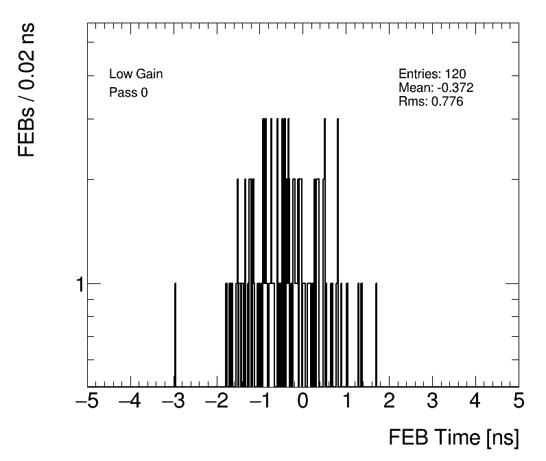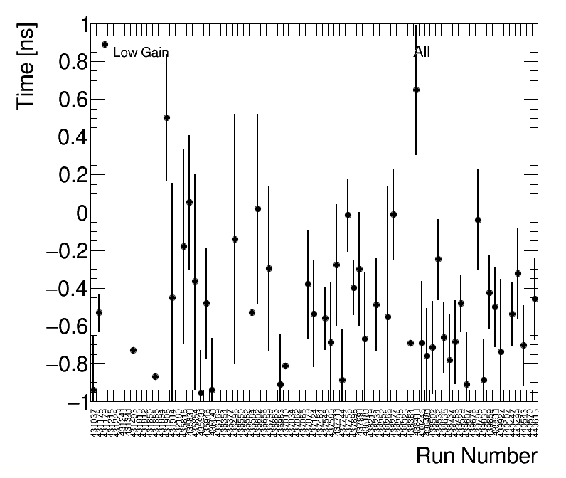 | Average FEB Time Low Gain (1) All FEBs by Run Number (2) All Runs by FEB |