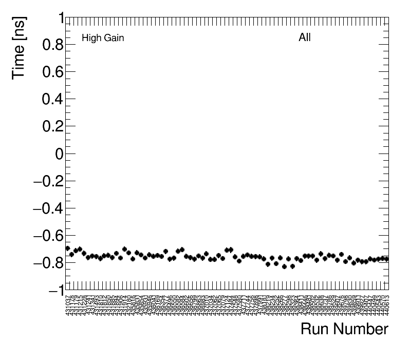 | Average FEB Time High Gain (1) All FEBs By Run Number (2) All Runs by FEB |