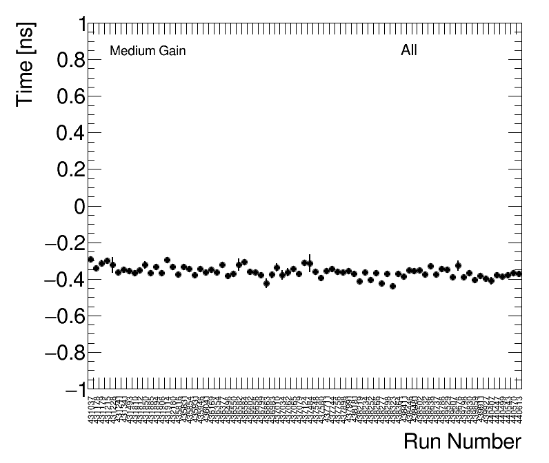 | Average FEB Time Medium Gain (1) All FEBs by Run Number (2) All Runs by FEB |