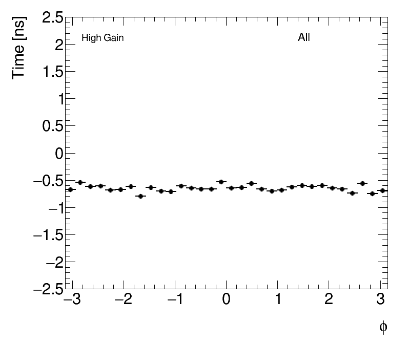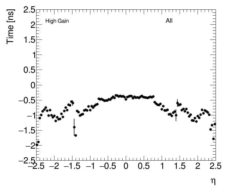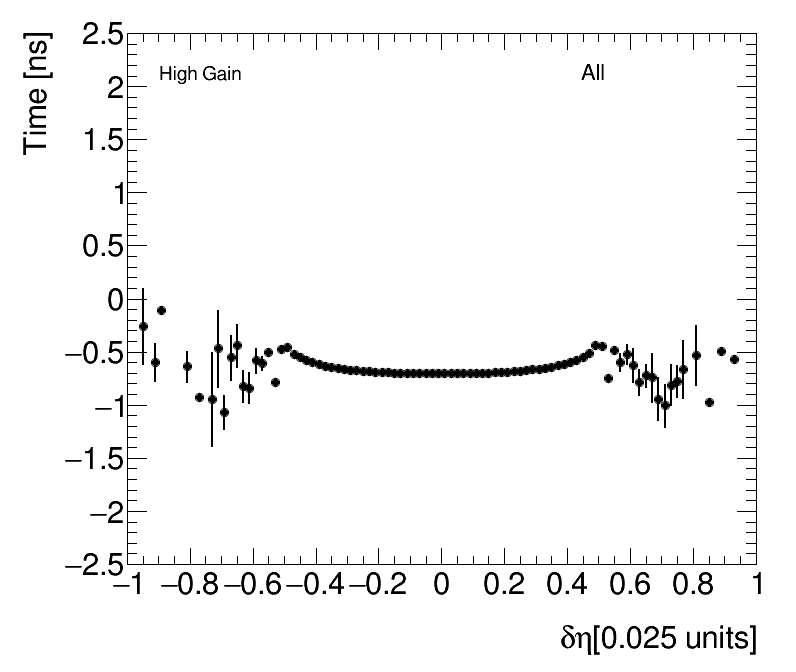 | Average Time vs Angular Cell Position High Gain (1) dPhi (2) dEta |