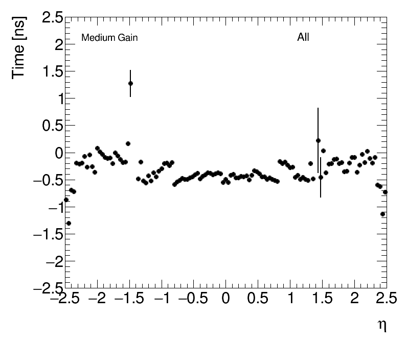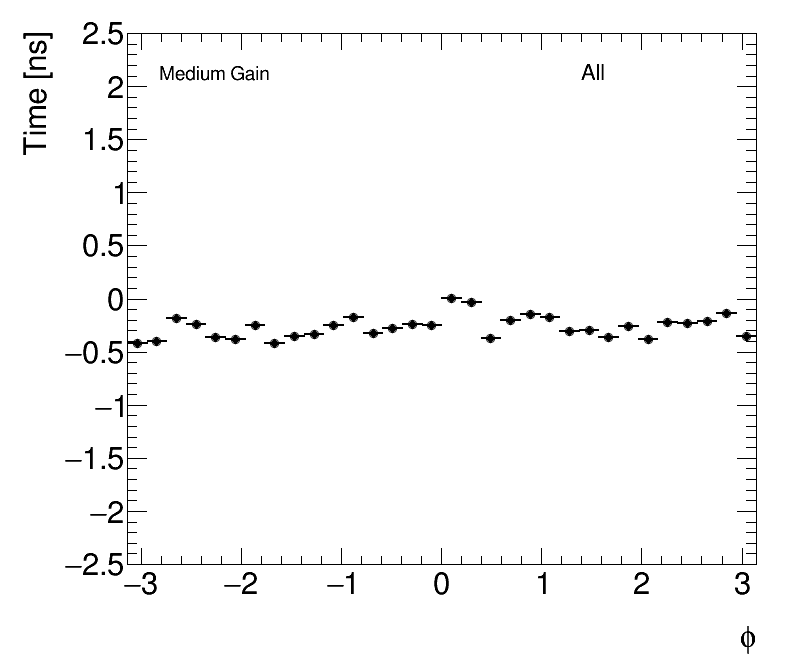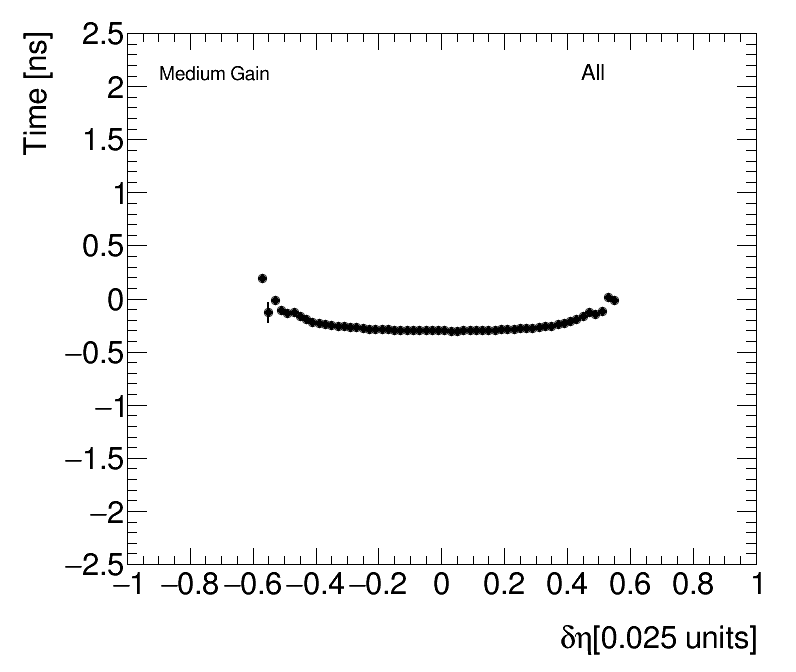 | Average Time vs Angular Cell Position Medium Gain (1) dPhi (2) dEta |