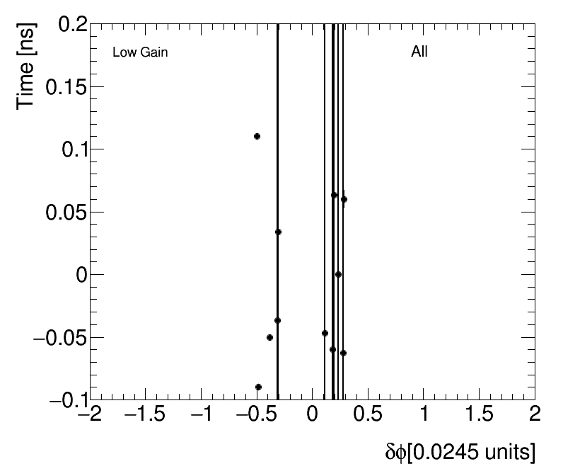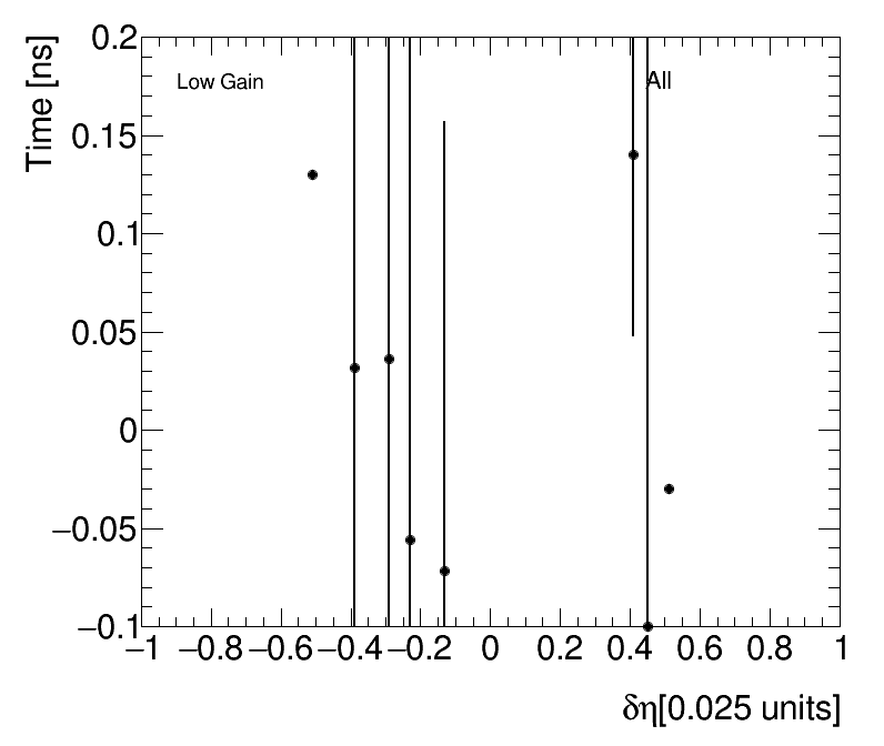 | Average Time vs Angular Cell Position Low Gain (1) dPhi (2) dEta |