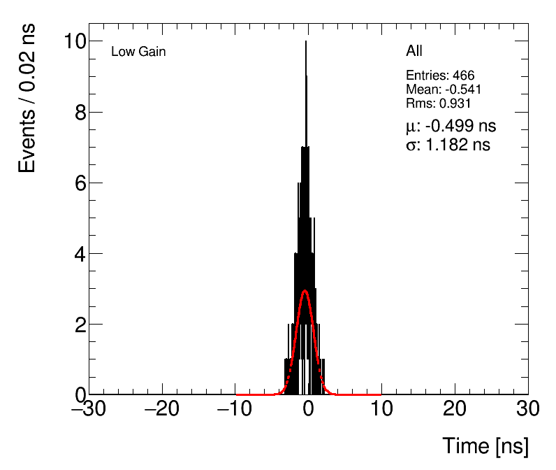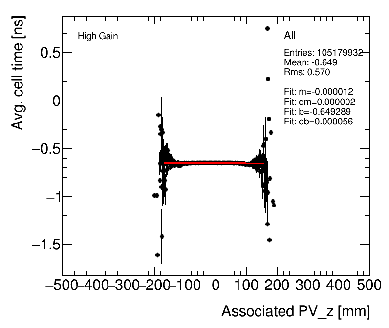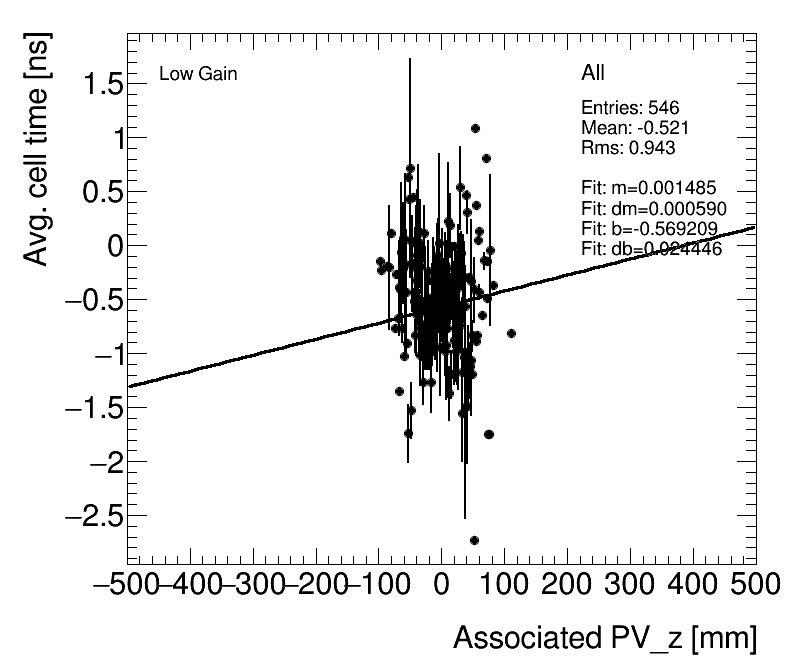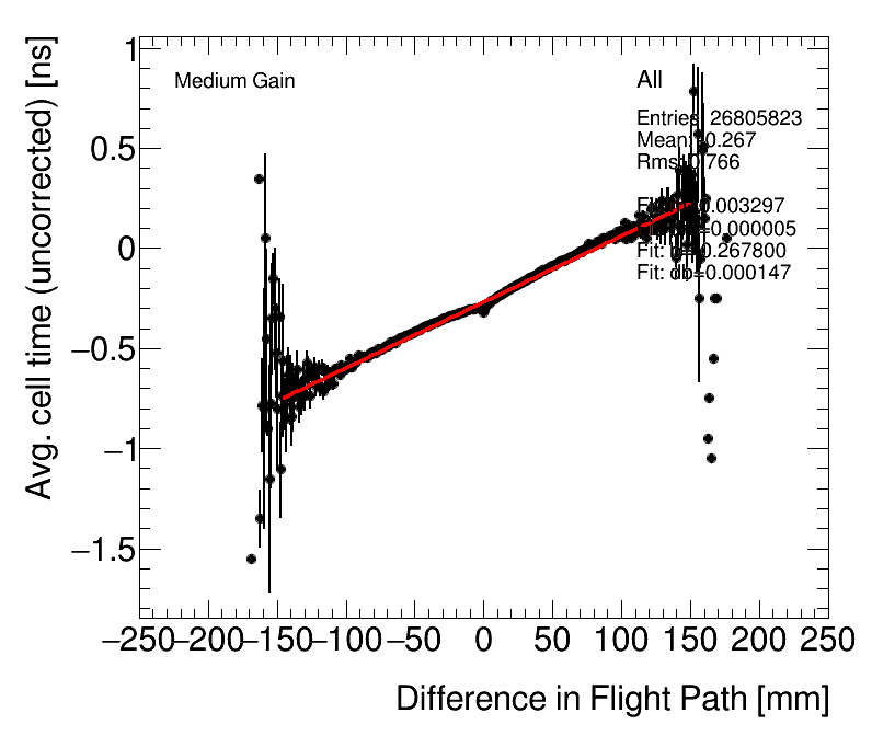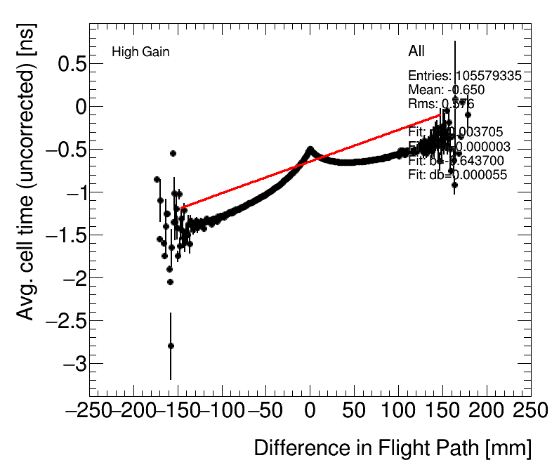 | Average Cell Time vs. Path length difference (After ToF Correction) High Gain (1) Celltime vs PathDiff (2) Adjusted for avg. PVz |