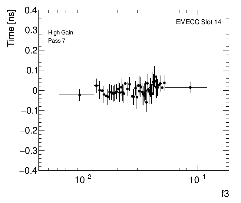 Average Cell Time vs Fractional Energy Deposit High Gain EMECC Slot 14 |