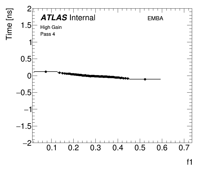 | Average Cell Time vs Fractional Energy Deposit High Gain EMBA |