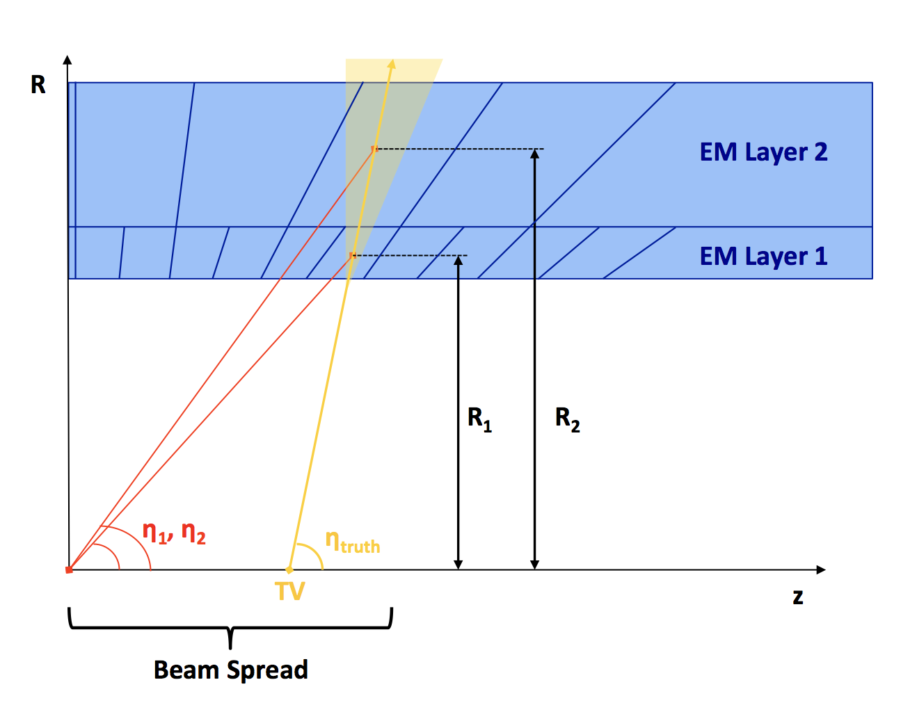 Calculate R1 and R2 for each event based on TV, etaTruth, and the eta of the barycenters (in red) | ![]() |