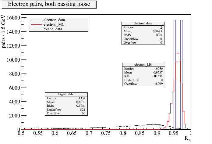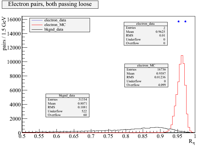 Results(7/02/2010): PT cut of greater than 10 GeV was used for all data.As more data becomes availalbe for this project, we will see more electrons from the data passing the looseloose cut, rather than only two, as well as starting to see electrons pass the tightight cut and mediummedium cut as well. For the first two electrons we do have, they are right in line with simulated electrons from our Monte Carlo simulations. The Rη values obtained from the real data on the two electrons that passed LooseLoose are very better than the mean Rη values of the Monte-Carlo data.