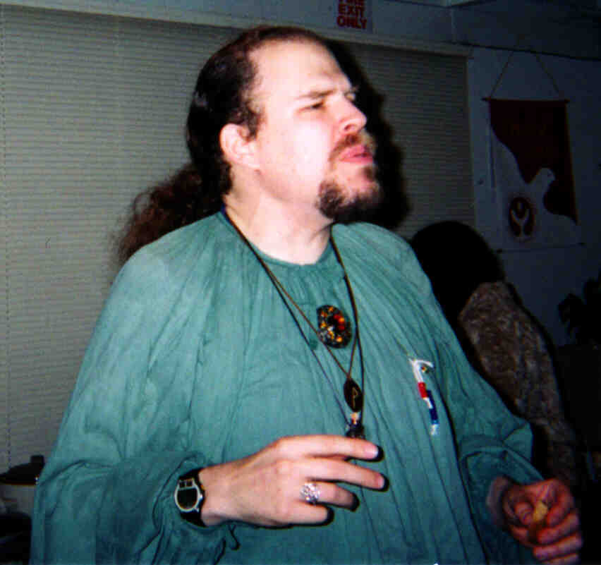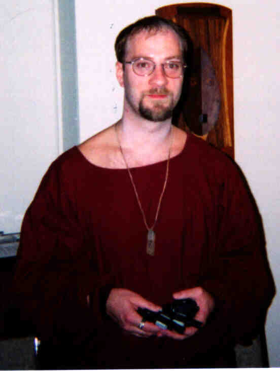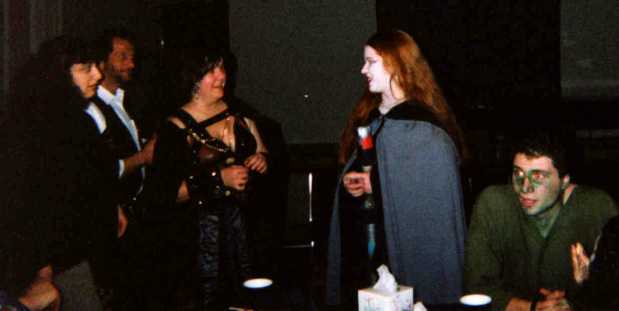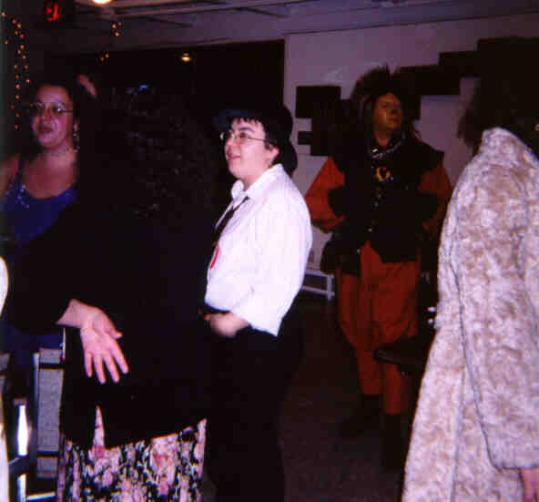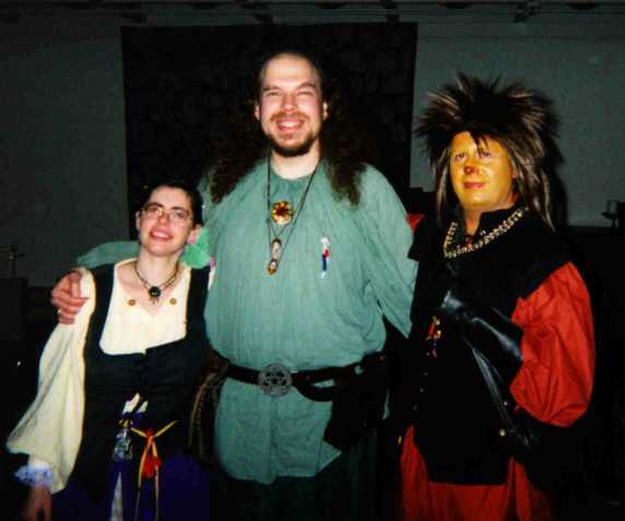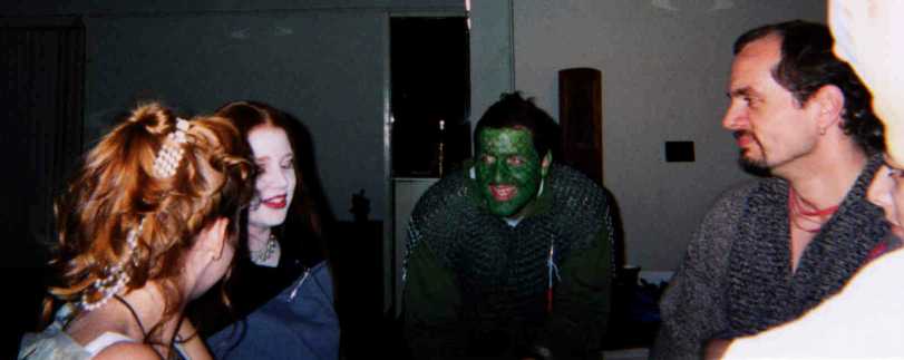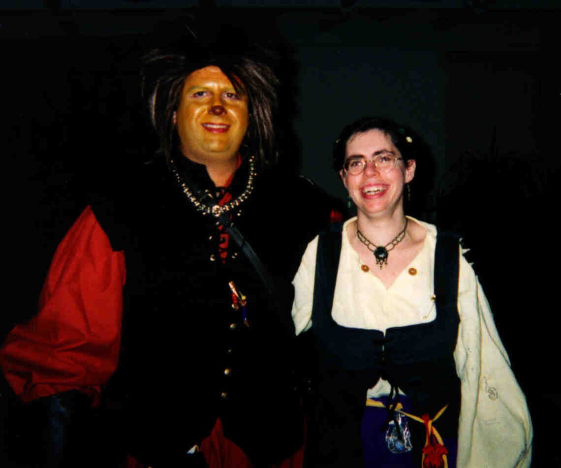 A high-resolution shot of John and Geela. They're both experienced role-players; note the details on their costumes. Look at John's make-up; that's not his real hair, it's a wig. Geela's costume was loaded with dangling pouches, mathoms, and nick-nacks that a Hobbit would carry. By the way, John and Geela win the longevity award: they were also at my 30th birthday party ten years ago. |