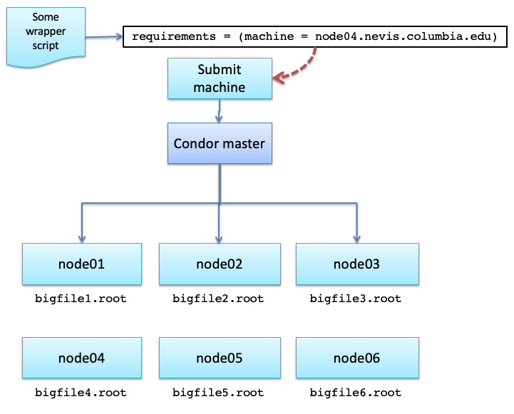Suppose your analysis requires reading large disk files. They’re too big to let condor do the transfer, and you also don’t want to hog the network bandwidth by reading them via NFS.