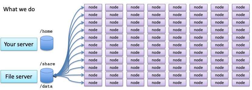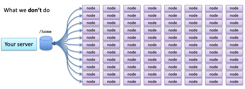 NFS is a robust protocol, but handling hundreds of access requests to the same location on a single partition is a bit much for it. If it’s just reading, the server may slow down so much that it becomes unusable, which irritates any users who are logged into that server to do their work. If those hundreds of jobs are writing to that directory at the same time, the server will crash.
