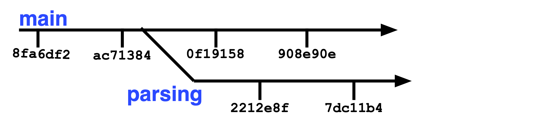 Figure 134: We’re going to create a brand-new branch in our code. I’ve arbitrarily called it “parsing”, because its purpose to add some kind of parsing to our code. On this new branch we can make new commits. We can also switch back to the main branch and commit completely separate changes if we wish. The two branches are separate.