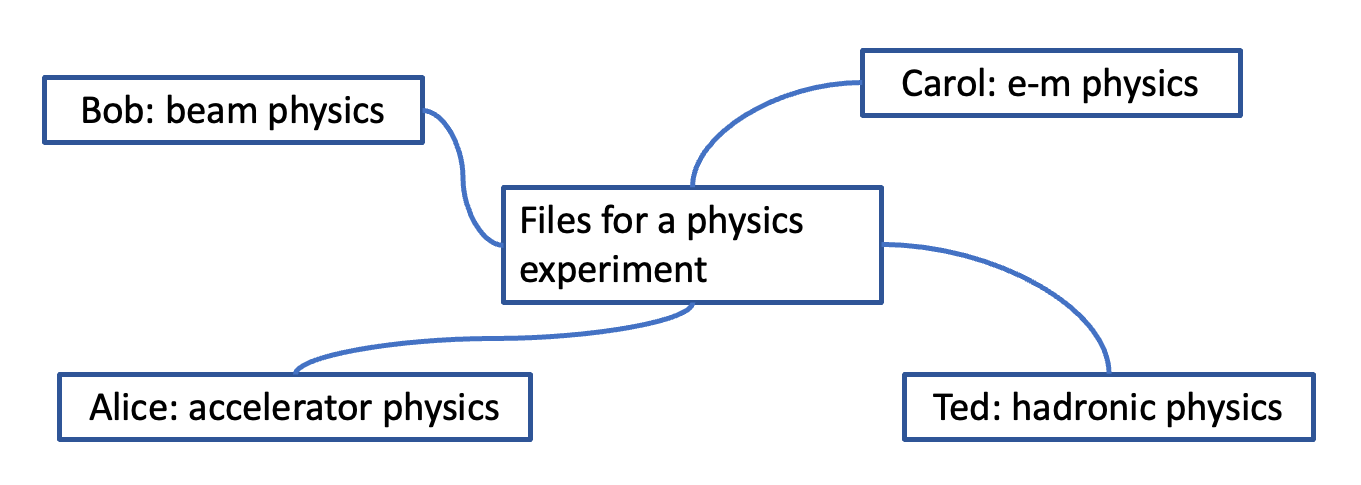 Figure 137: Here’s a sketch of what a physics software development environment might look like. A group of physicists are all working from the same code base. Perhaps they’re each creating their own branches as they work on their areas of expertise. At some point they’ll coordinate with each other (larger experiments have a software manager) to merge their work into the code in the central repository.