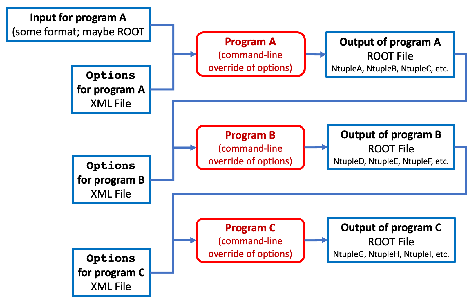 Figure 72: Here’s a diagram of a hypothetical physics analysis chain from a project I wrote. The original purpose of the diagram was to illustrate how program options can be used to control the processing of the individual tasks. Here, I ask that you focus on how the output of program A becomes the input of program B, and so on.