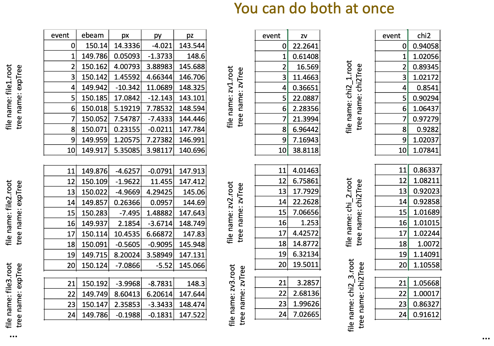 The previous section talked about Chains, in which an n-tuple’s rows were distributed across multiple files. With ROOT’s Friends, we have a way of distributing an n-tuple’s columns across multiple files.