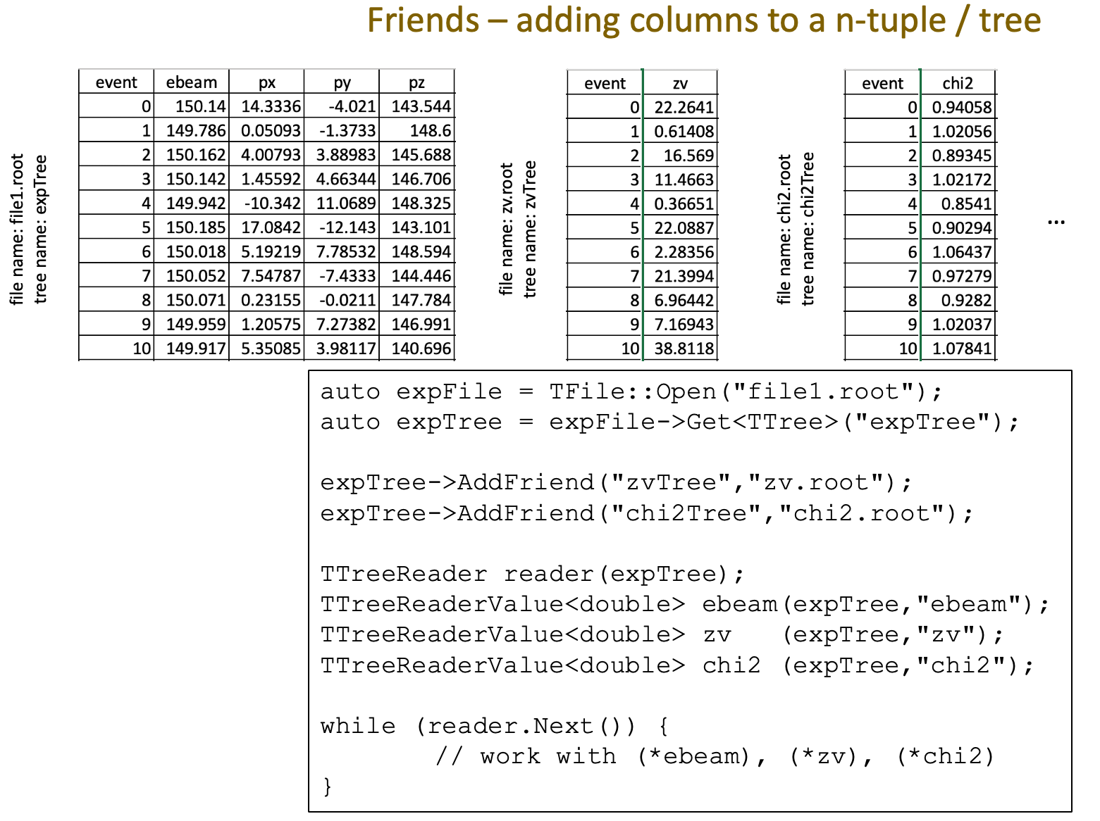 Because this is a slide from a C++ talk, the example code in Figure 71 uses TTreeReader to access the columns of the Friends. However, the same procedure applies no matter which language you use to access the tree: